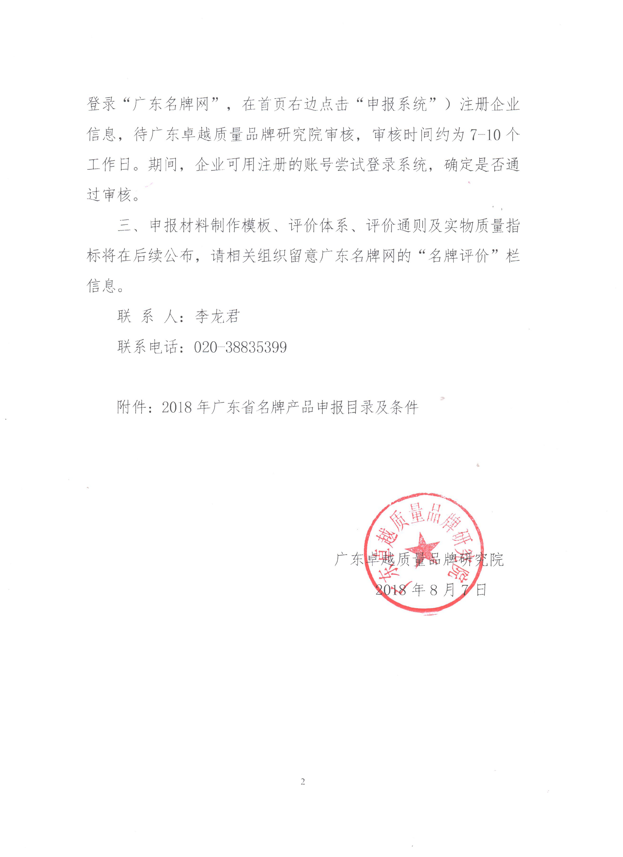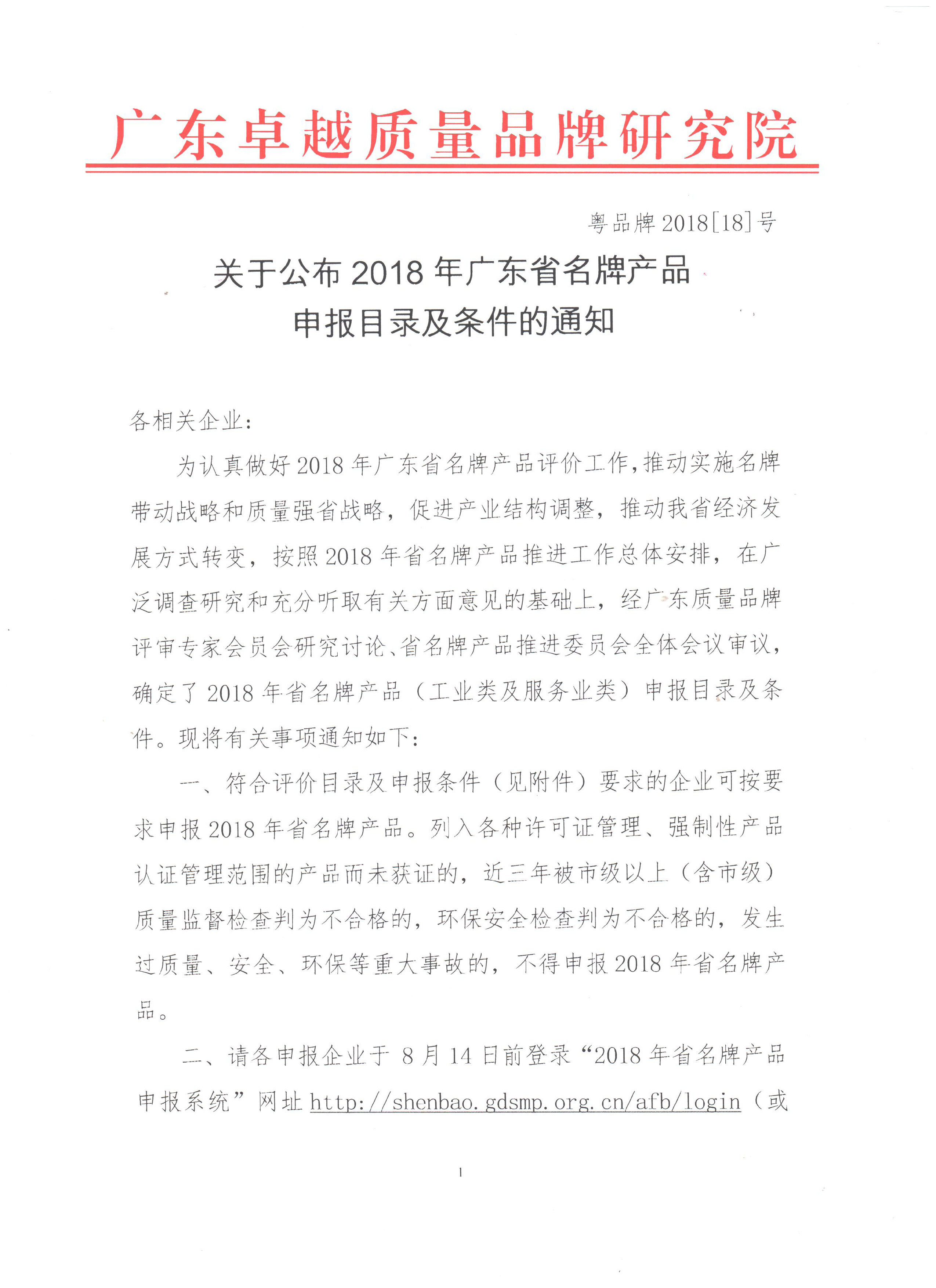 关于公布2018年广东省名牌产品申报目录及条件的通知