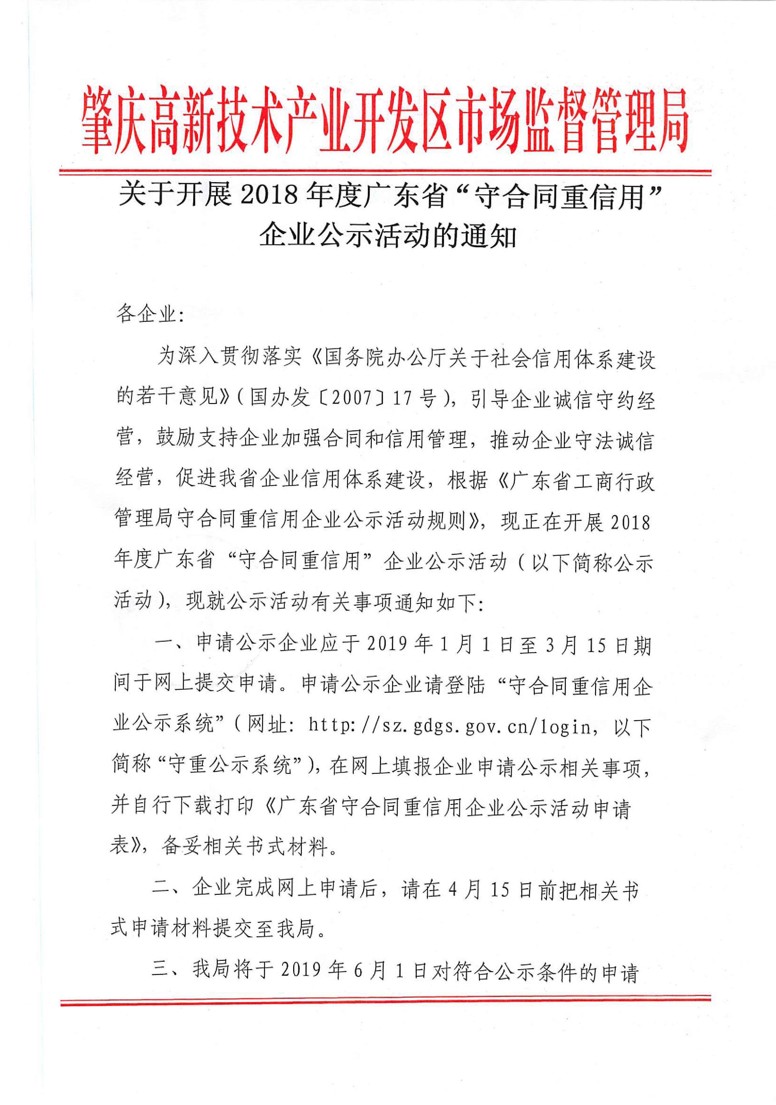 关于开展2018年度广东省“守合同重信用”企业公示活动的通知